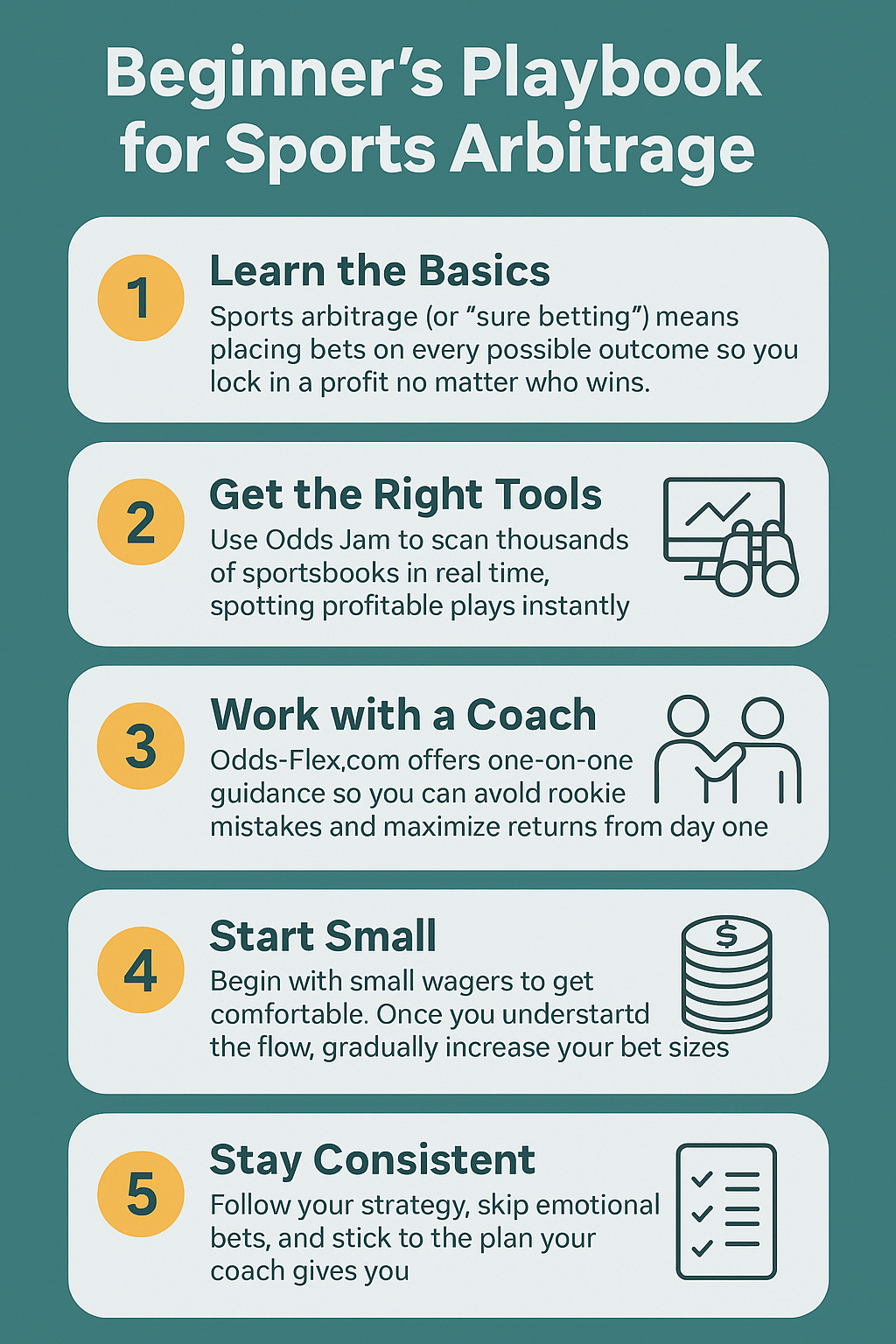 If you want to learn sports arbitrage the right way, you’re in the perfect spot. With Odds Jam software and expert coaching from Odds-Flex.com, you can level up fast. Here’s your beginner-friendly playbook: With the right tools and guidance, you can turn sports arbitrage into a consistent, profitable system—without gambling in the traditional sense.